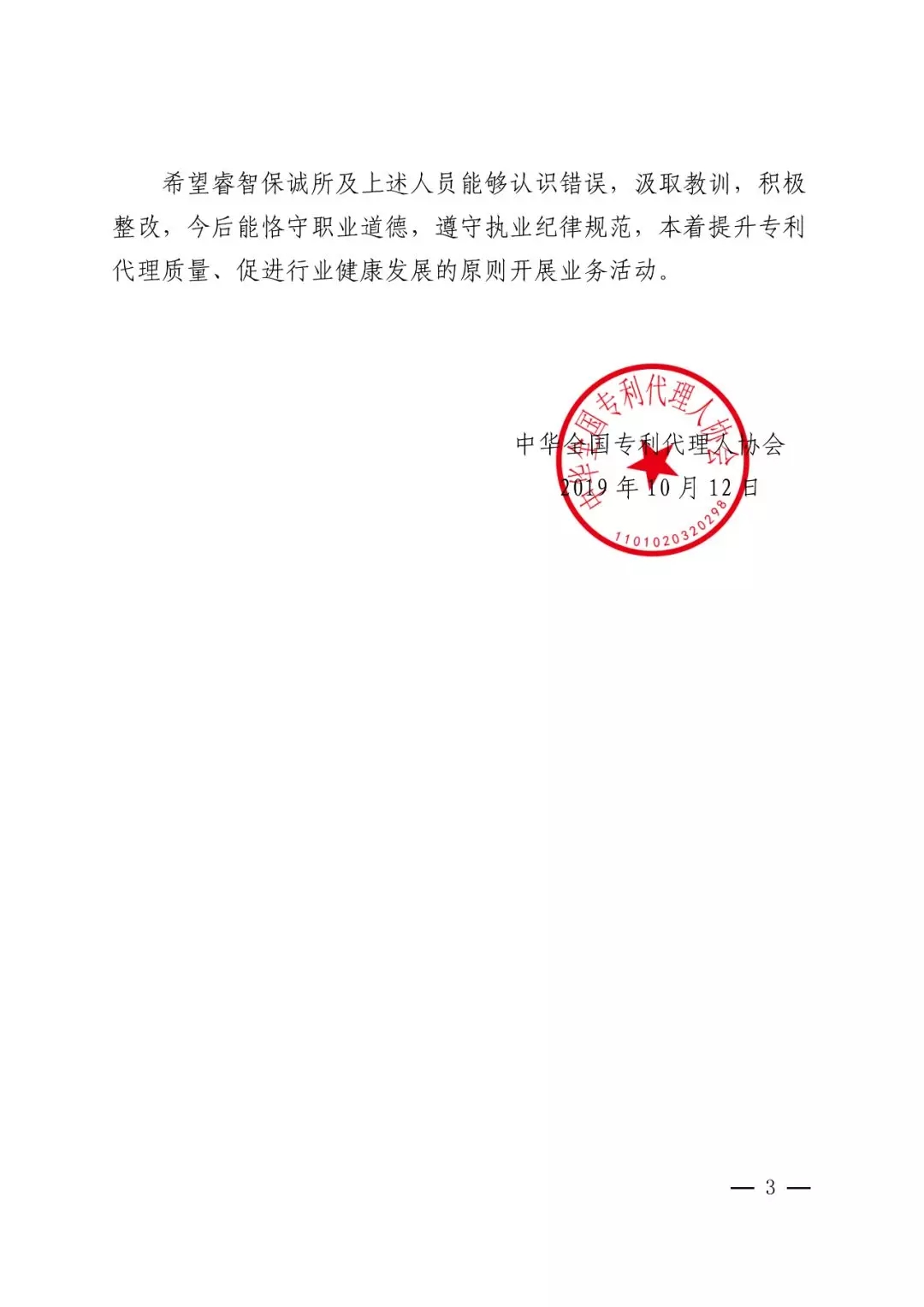 附件3:關于給予北京睿智保誠專利代理事務所(普通合伙)及其法定代表人周新楣通報批評處分的決定